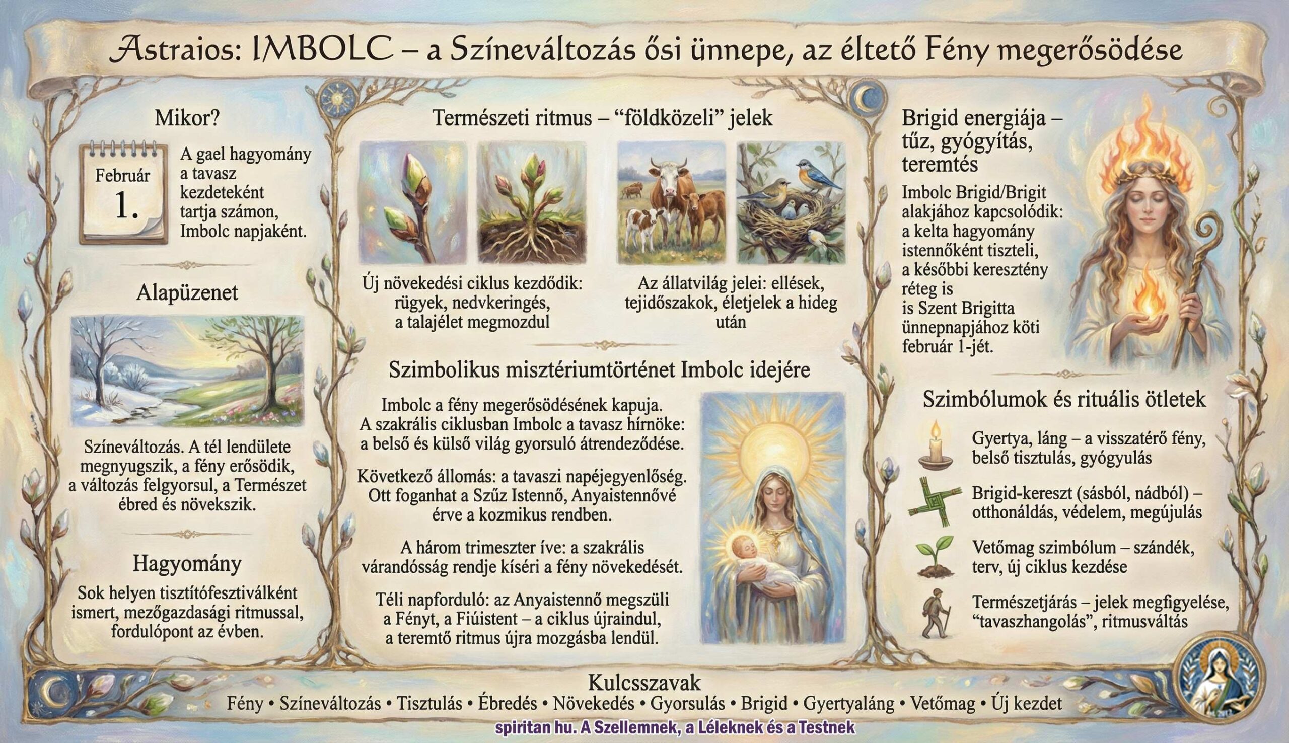Imbolc február 1-jén érkezik, a tél és a tavaszi napéjegyenlőség közé ékelődő évkör-kapu. A hagyomány a napot a tavasz kezdetének jelzőjeként tartja számon, a fény megerősödésével, a változás felgyorsulásával és a Természet ébredező növekedésével.